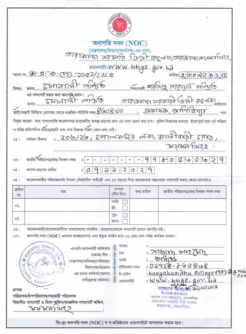তারাকান্দা সরকারি ডিগ্রি কলেজ, তারাকান্দা, ময়মনসিংহ এর প্রাণিবিদ্যা বিষয়ের প্রভাষক জনাব সোনালী পন্ডিত এর অনাপত্তি সদন (NOC)।