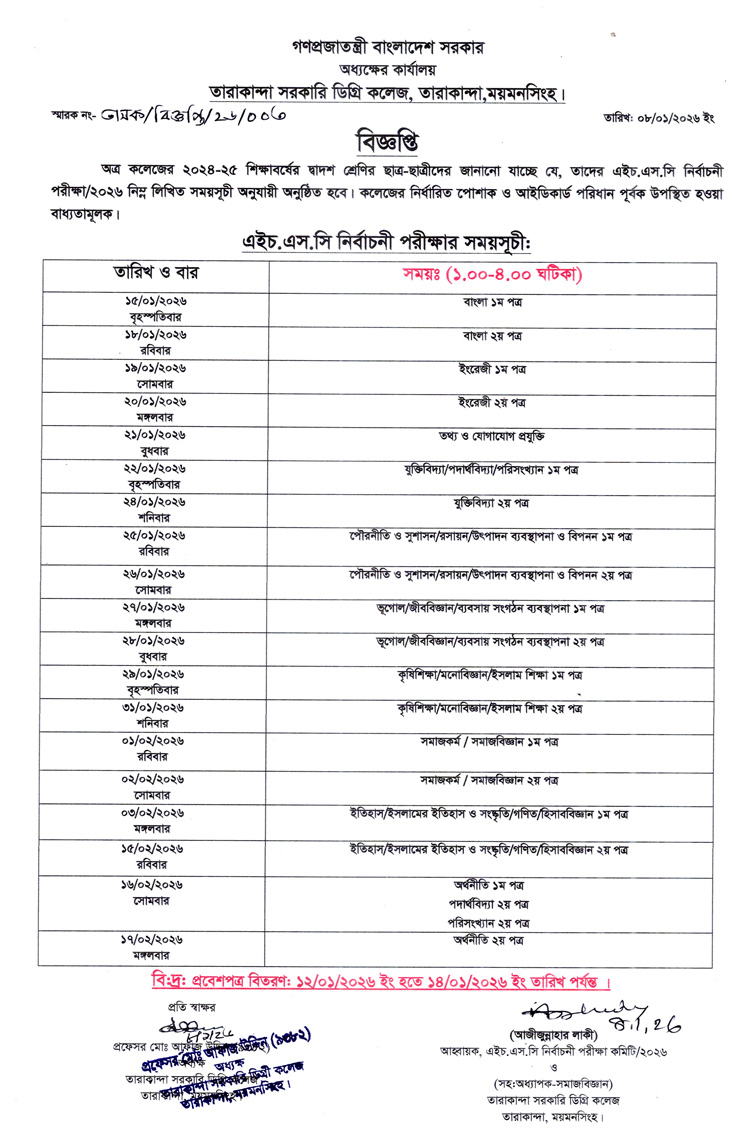 বিজ্ঞপ্তিঃ০০৩ (এইচ.এস.সি দ্বাদশ শ্রেণির নির্বাচনী পরীক্ষার সময়সূচি)