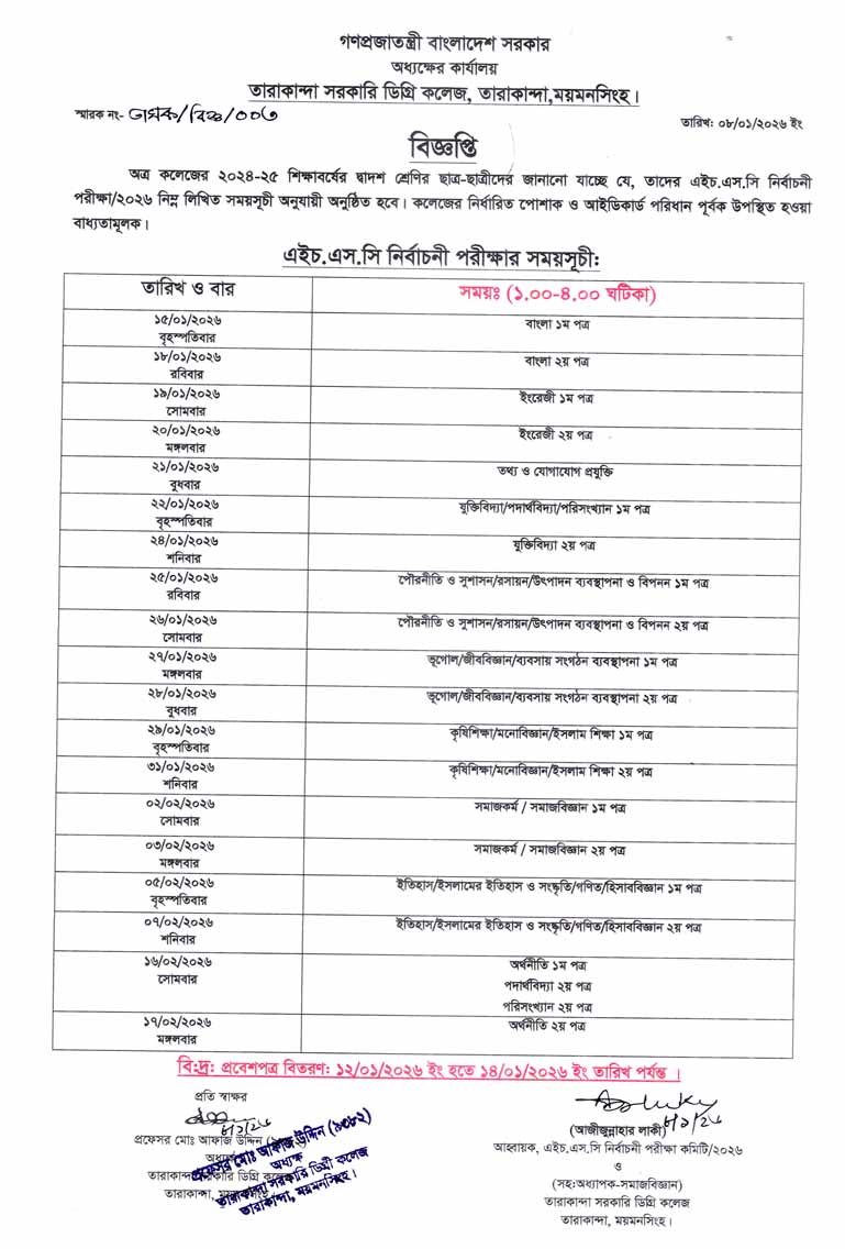 বিজ্ঞপ্তিঃ০০৩ (এইচ.এস.সি দ্বাদশ শ্রেণির নির্বাচনী পরীক্ষার সময়সূচি)