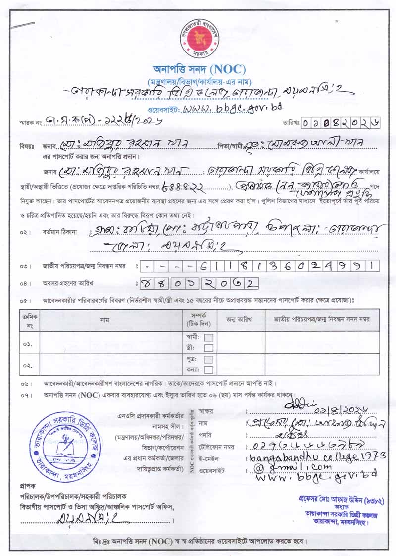 বঙ্গবন্ধু সরকারি ডিগ্রি কলেজ, তারাকান্দা, ময়মনসিংহ এর ইসলামি শিক্ষা বিষয়ের প্রভাষক জনাব আবুল বাশার মোহা: মোস্তফা কামাল এর অনাপত্তি সদন (NOC)।
