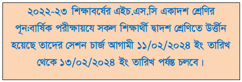 | 178 | ২০২২-২৩ শিক্ষাবর্ষের এইচ.এস.সি একাদশ শ্রেণির পূন: বার্ষিক পরীক্ষায় উর্ত্তীন শিক্ষার্থীদের সেশন চার্জ আগামী ১১/০২/২৪ ইং তারিখ থেকে ১৩/০২/২৪ ইং তারিখ পর্যন্ত চলেবে। | 2024-02-08 | ডাউনলোড | দেখুন |