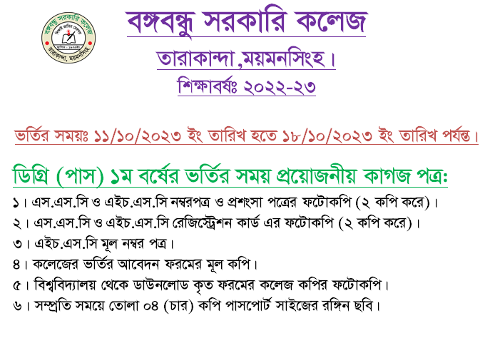 | 262 | তারাকান্দা সরকারি ডিগ্রি কলেজের কর্মরত ও অবসরপ্রাপ্ত শিক্ষক-কর্মচারীদের পূনর্মিলনী অনুষ্ঠান /২০২৫ ইং তারিখ: ১৫/১২/২০২৫, সোমবার স্থান : গজনী,শেরপুর এন্ট্রি/নিশ্চায়ন ফি: ১০০/- (জনপ্রতি) গেস্টের জন্য চাদা = ৮০০/- ( স্বামী / স্ত্রী, ছেলে মেয়ে) ১২ বছরের চে | 2025-12-01 | ডাউনলোড | দেখুন |