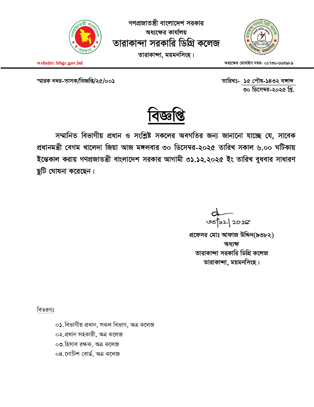২০২২-২৩ শিক্ষাবর্ষের ডিগ্রি ২য় বর্ষের প্রথম ও দ্বিতীয় ইনকোর্স পরীক্ষা-২০২৪ এর পরীক্ষার্থীদের জন্য বিশেষ বিজ্ঞপ্তিঃ ১ম ইনকোর্স পরীক্ষাঃ ০১/১২/২০২৫ ইং তারিখ (যারা ইতিপূর্বে ১ম ইনকোর্স পরীক্ষায় অংশগ্রহণ করেনি) ২য় ইনকোর্স পরীক্ষাঃ ০২/১২/২০২৫ ইং তারিখ (যারা ইতিপূর্বে ২য় ইনকোর্স পরীক্ষায় অংশগ্রহণ করেনি) বি.দ্র: উল্লেখ্য যে যেহেতু ডিগ্রি ২য় বর্ষ ১ম ও ২য় ইনকোর্স পরীক্ষার খাতা ও হাজিরা শীট জাতীয় বিশ্ববিদ্যালয়ে প্রেরন করতে হবে, তাই যারা ডিগ্রি ২য় বর্ষের ১ম ও ২য় ইনকোর্স পরীক্ষায় অংশগ্রহণ করবে না তাদের ফরম পূরণের সুযোগ নেই। তাই উপরিউল্লেখিত তারিখ অনুযায়ী ডিগ্রি ২য় বর্ষের ১ম ও ২য় ইনকোর্স পরীক্ষায় অংশগ্রহণ করা বাধ্যতামূলক। ধন্যবাদান্তে আহ্বায়ক, ডিগ্রি পাস ও সার্টিফিকেট কোর্স ২য় বর্ষের প্রথম ও দ্বিতীয় ইনকোর্স পরীক্ষা-২০২৪ তারাকান্দা সরকারি ডিগ্রি কলেজ তারাকান্দা, ময়মনসিংহ।