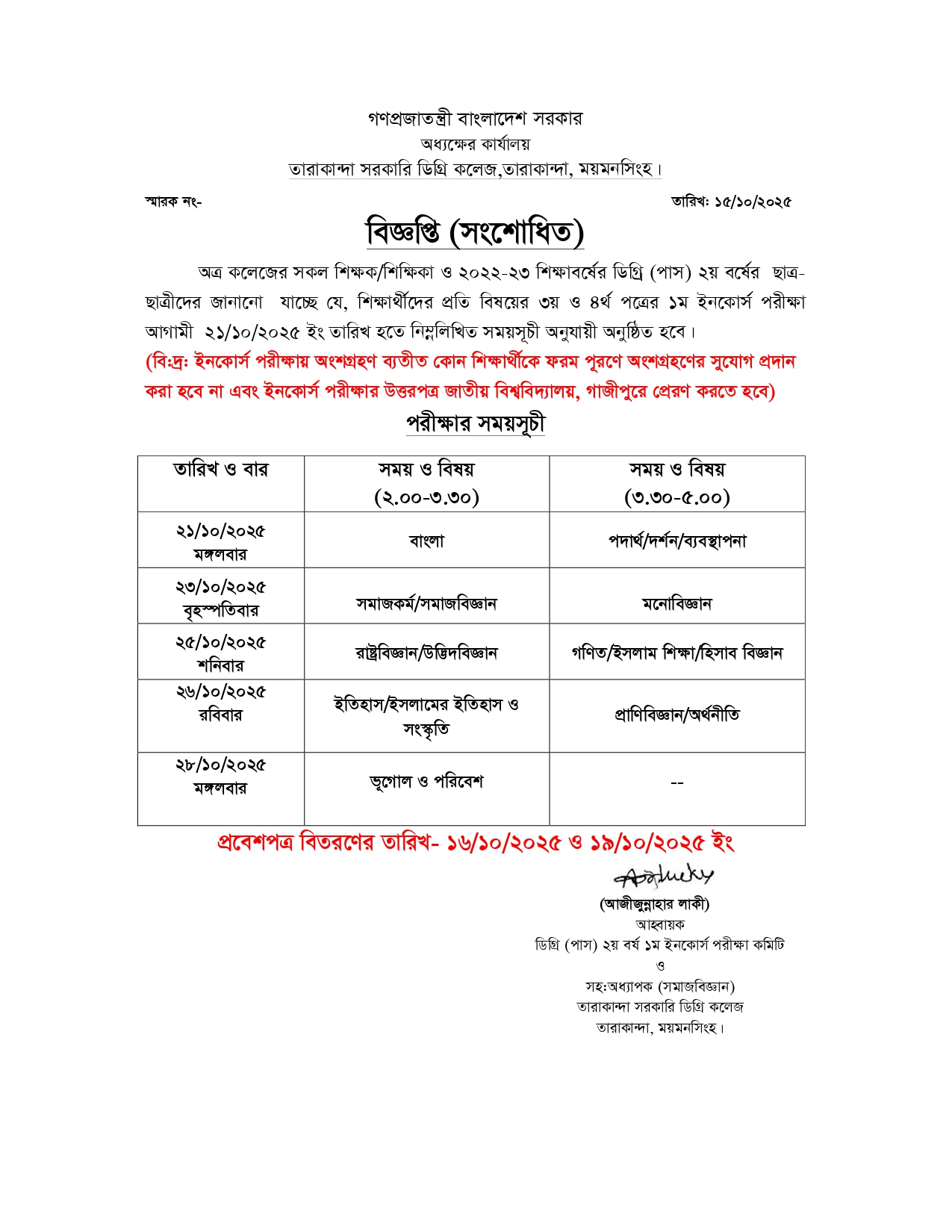 বিজ্ঞপ্তিঃ ২০২৩-২৪ শিক্ষাবর্ষের ডিগ্রি (পাস) ১ম বর্ষের শিক্ষার্থীদের পুন: ইনকোর্স পরীক্ষার তারিখ: ১৪/০৯/২০২৫ খ্রি.