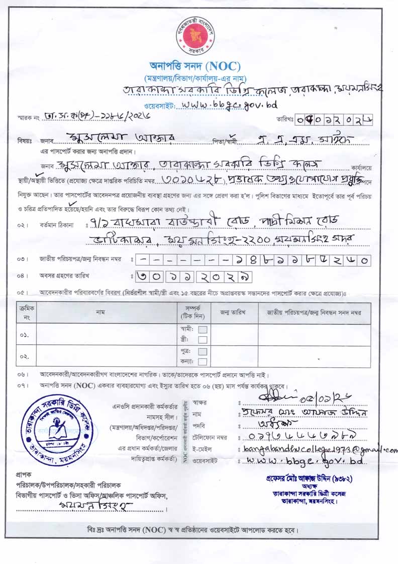 বঙ্গবন্ধু সরকারি ডিগ্রি কলেজ, তারাকান্দা, ময়মনসিংহ এর ইসলামি শিক্ষা বিষয়ের প্রভাষক জনাব আবুল বাশার মোহা: মোস্তফা কামাল এর অনাপত্তি সদন (NOC)।