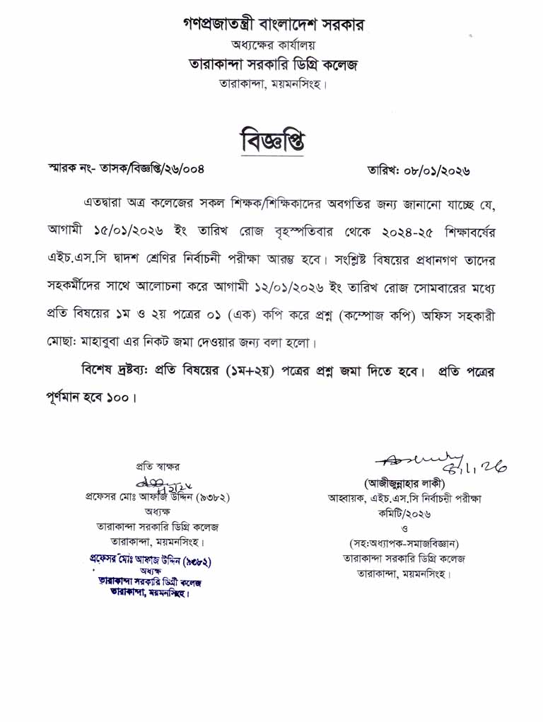 বিজ্ঞপ্তিঃ ২০২৩-২৪ শিক্ষাবর্ষের ডিগ্রি পাস ও সার্টিফিকেট কোর্স ১ম বর্ষ পরীক্ষাঃ ২১/০৯/২০২৫ ইং তারিখ।