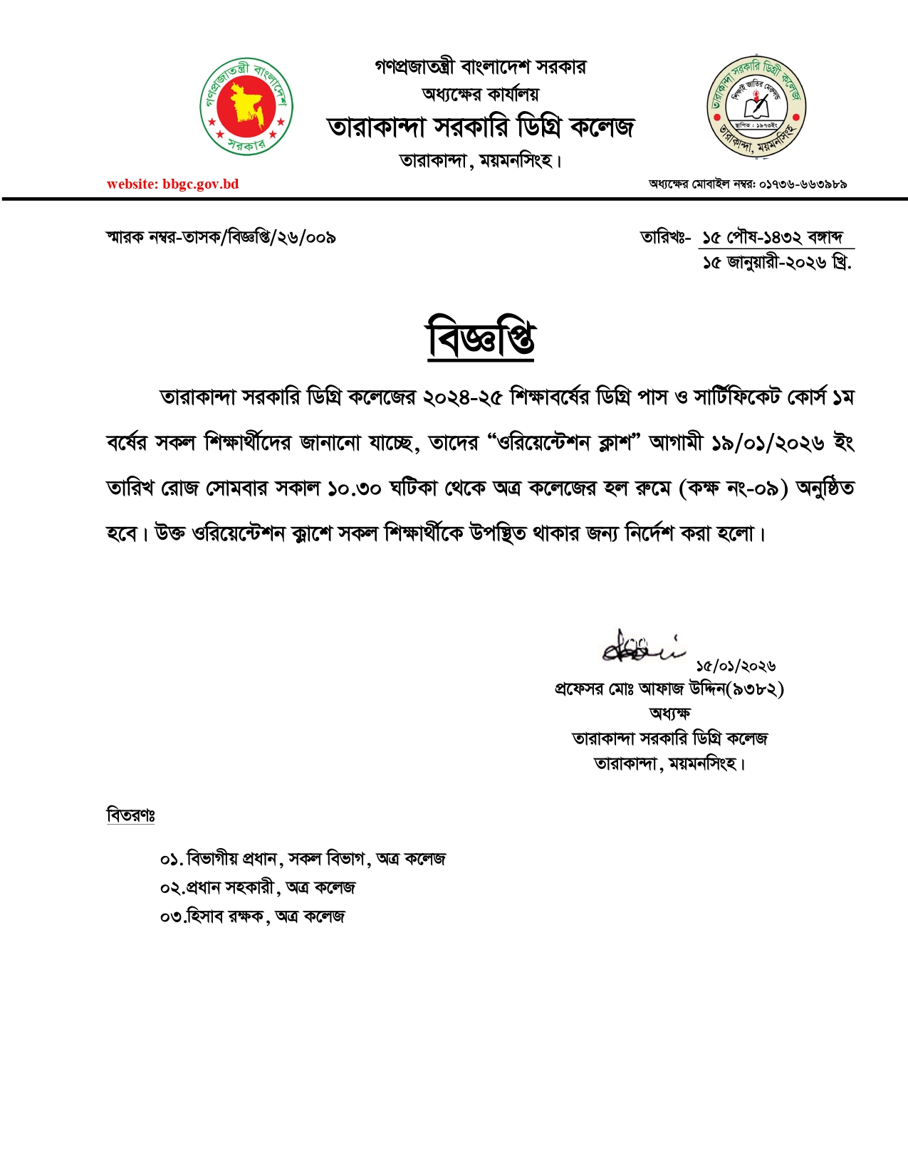 বিজ্ঞপ্তিঃ ডিগ্রি পাস ও সার্টিফিকেট কোর্স ১ম বর্ষের ওরিয়েন্টেশন ক্লাশ শুরু - আগামী ১৯/০১/২০২৬ ইং তারিখ রোজ সোমবার সকাল ১০.৩০ ঘটিকায়।