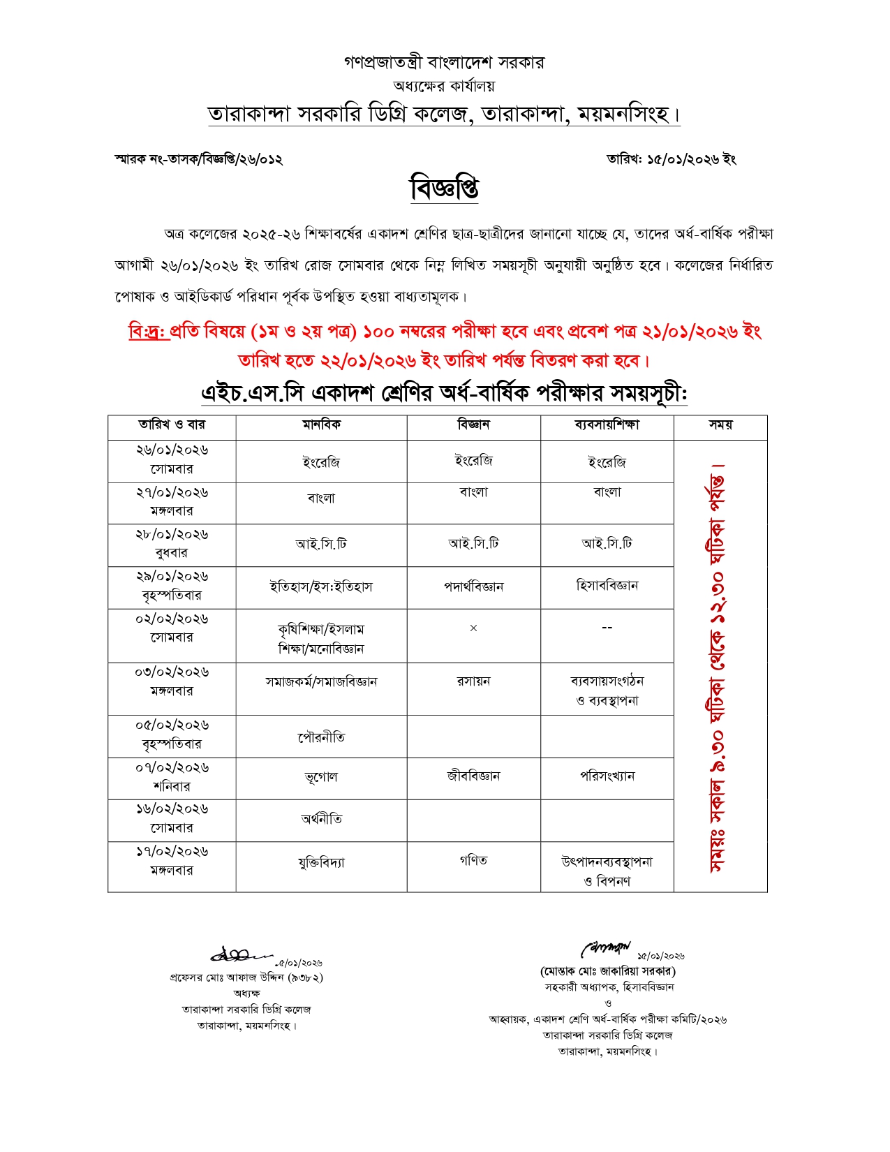 ২০২৩-২৪ শিক্ষাবর্ষের এইচ.এস.সি একাদশ শ্রেণির অর্ধ-বার্ষিক পরীক্ষার সময়সূচী: