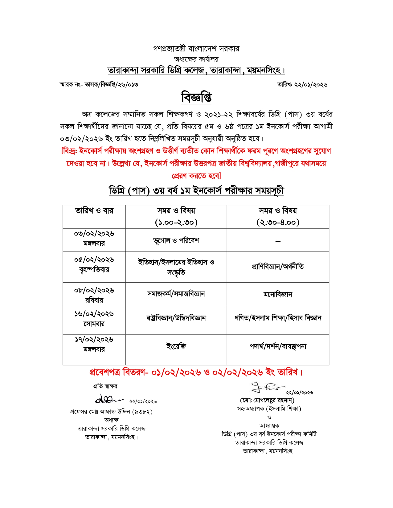 বিজ্ঞপ্তিঃ ২০২৩-২৪ শিক্ষাবর্ষের ডিগ্রি (পাস) ১ম বর্ষের শিক্ষার্থীদের পুন: ইনকোর্স পরীক্ষার তারিখ: ১৪/০৯/২০২৫ খ্রি.