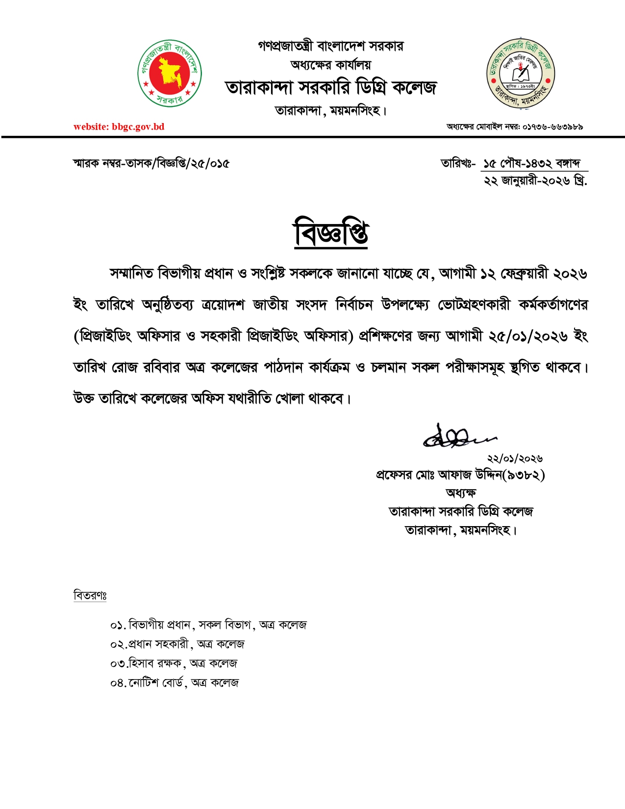 নোটিশঃ ০১৮     তারাকান্দা সরকারি ডিগ্রি কলেজ, তারাকান্দা, ময়মনসিংহ এর মনোবিজ্ঞান বিষয়ের সহকারী অধ্যাপক জনাব মোঃ আনিছুর রহমান এর অনাপত্তি সদন (NOC)।     বিজ্ঞপ্তিঃ একাদশ শ্রেণির অর্ধ -বার্ষিক পরীক্ষার সময়সূচি-     বিজ্ঞপ্তিঃ এইচ.এস.সি (বি.এম.টি) ১ম ও ২য় বর্ষ নির্বাচনী পরীক্ষার সময়সূচি-     বিজ্ঞপ্তিঃ ০১০     বিজ্ঞপ্তিঃ ডিগ্রি পাস ও সার্টিফিকেট কোর্স ১ম বর্ষের ওরিয়েন্টেশন ক্লাশ শুরু - আগামী ১৯/০১/২০২৬ ইং তারিখ রোজ সোমবার সকাল ১০.৩০ ঘটিকায়।     বিজ্ঞপ্তিঃ০০৩ (এইচ.এস.সি দ্বাদশ শ্রেণির নির্বাচনী পরীক্ষার সময়সূচি)     নোটিশঃ ০০৪     তারাকান্দা সরকারি ডিগ্রি কলেজ, তারাকান্দা, ময়মনসিংহ এর তথ্য ও যোগাযোগ বিষয়ের প্রভাষক জনাব মুসলেমা আক্তার এর অনাপত্তি সদন (NOC)।     নোটিশঃ     তারাকান্দা সরকারি ডিগ্রি কলেজের কর্মরত ও অবসরপ্রাপ্ত শিক্ষক-কর্মচারীদের পূনর্মিলনী অনুষ্ঠান /২০২৫ ইং তারিখ: ১৫/১২/২০২৫, সোমবার স্থান : গজনী,শেরপুর এন্ট্রি/নিশ্চায়ন ফি: ১০০/- (জনপ্রতি) গেস্টের জন্য চাদা = ৮০০/- ( স্বামী / স্ত্রী, ছেলে মেয়ে) ১২ বছরের চেয়ে ছোট সন্তানের জন্য= ৬৫০/- আগামী ০৯/১২/২০২৫ এর মধ্যে ১০০/- টাকা এন্ট্রি ফি এবং গেস্টের জন্য নির্ধারিত চাঁদা প্রদান করে নাম এন্ট্রি করতে হবে। অবসরপ্রাপ্ত সকলকে বিদায়ী সংবর্ধনা ও ক্রেস্ট প্রদান করা হবে। (বি: দ্র: নাম এন্ট্রির সিরিয়াল অনুযায়ী বাসের টিকিট দেওয়া হবে।) নাম এন্ট্রির জন্য যোগাযোগঃ ড.মোঃ মোখলেছুর রহমান     ২০২২-২৩ শিক্ষাবর্ষের ডিগ্রি ২য় বর্ষের প্রথম ও দ্বিতীয় ইনকোর্স পরীক্ষা-২০২৪ এর পরীক্ষার্থীদের জন্য বিশেষ বিজ্ঞপ্তিঃ ১ম ইনকোর্স পরীক্ষাঃ ০১/১২/২০২৫ ইং তারিখ (যারা ইতিপূর্বে ১ম ইনকোর্স পরীক্ষায় অংশগ্রহণ করেনি) ২য় ইনকোর্স পরীক্ষাঃ ০২/১২/২০২৫ ইং তারিখ (যারা ইতিপূর্বে ২য় ইনকোর্স পরীক্ষায় অংশগ্রহণ করেনি) বি.দ্র: উল্লেখ্য যে যেহেতু ডিগ্রি ২য় বর্ষ ১ম ও ২য় ইনকোর্স পরীক্ষার খাতা ও হাজিরা শীট জাতীয় বিশ্ববিদ্যালয়ে প্রেরন করতে হবে, তাই যারা ডিগ্রি ২য় বর্ষের ১ম ও ২য় ইনকোর্স পরীক্ষায় অংশগ্রহণ করবে না তাদের ফরম পূরণের সুযোগ নেই। তাই উপরিউল্লেখিত তারিখ অনুযায়ী ডিগ্রি ২য় বর্ষের ১ম ও ২য় ইনকোর্স পরীক্ষায় অংশগ্রহণ করা বাধ্যতামূলক। ধন্যবাদান্তে আহ্বায়ক, ডিগ্রি পাস ও সার্টিফিকেট কোর্স ২য় বর্ষের প্রথম ও দ্বিতীয় ইনকোর্স পরীক্ষা-২০২৪ তারাকান্দা সরকারি ডিগ্রি কলেজ তারাকান্দা, ময়মনসিংহ।     তারাকান্দা সরকারি ডিগ্রি কলেজ, তারাকান্দা, ময়মনসিংহ এর তথ্য ও যোগাযোগ বিষয়ের প্রভাষক জনাব মুসলেমা আক্তার এর অনাপত্তি সদন (NOC)।     তারাকান্দা সরকারি ডিগ্রি কলেজ, তারাকান্দা, ময়মনসিংহ এর ভূগোল বিষয়ের সহকারী অধ্যাপক মো: শফিকুল ইসলাম এর অনাপত্তি
