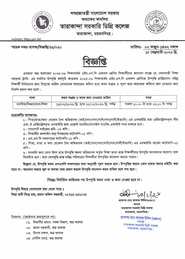 ২০২৫-২৬ শিক্ষাবর্ষের এইচ.এস.সি একাদশ শ্রেণির শিক্ষার্থীদের উপবৃত্তি সংক্রান্ত বিজ্ঞপ্তিঃ