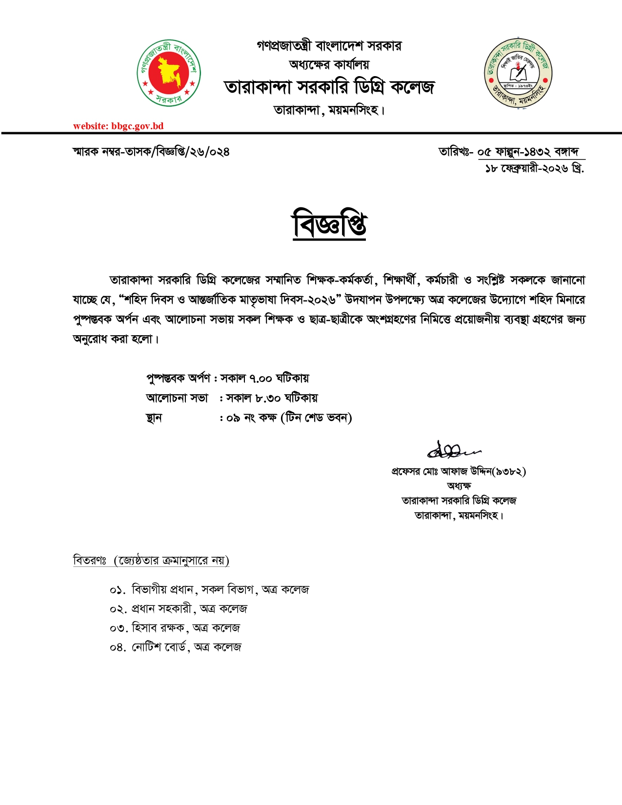 ২১ ফেব্রুয়ারি/২০২৬ ইং তারিখে “শহিদ দিবস ও আন্তর্জাতিক মাতৃভাষা দিবস-২০২৬ উদযাপন উপলক্ষ্যে নোটিশঃ