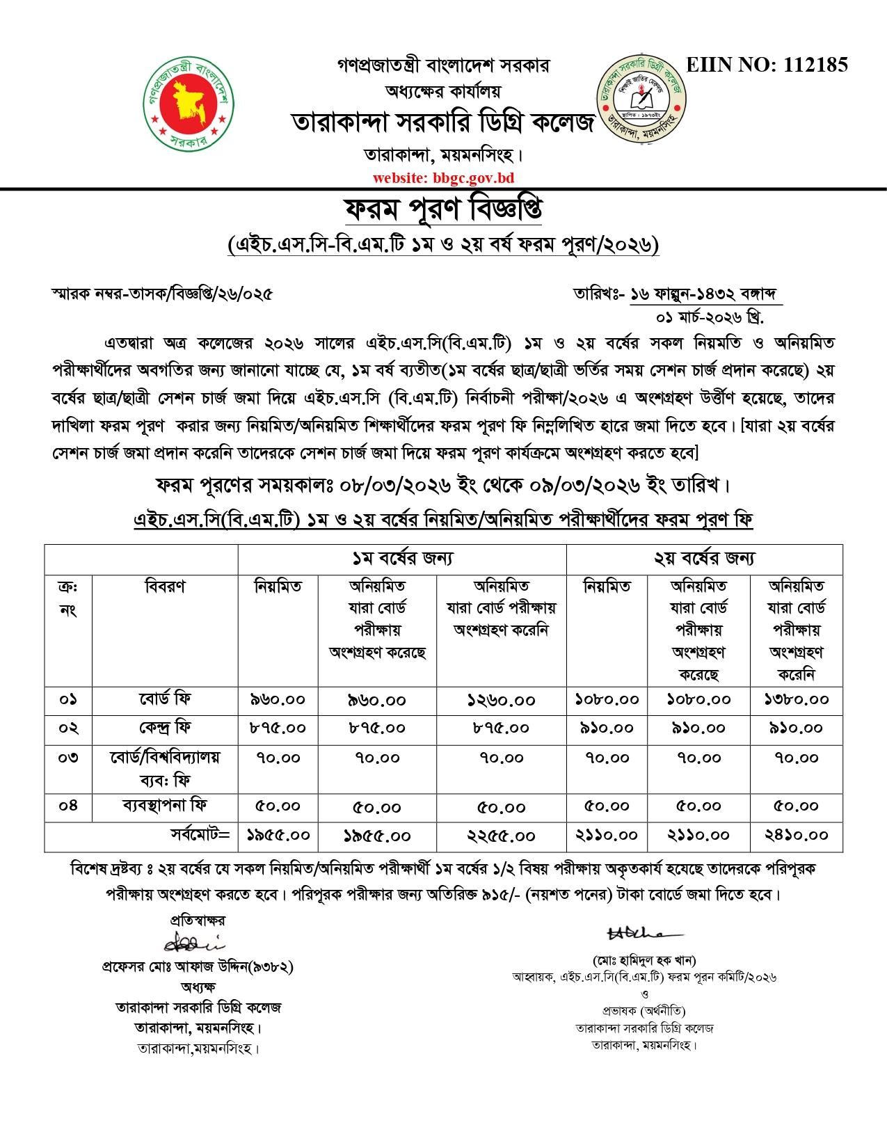 এইচএসসি (বিএমটি) ফরম পূরণ/২০২৬ বিজ্ঞপ্তিঃ