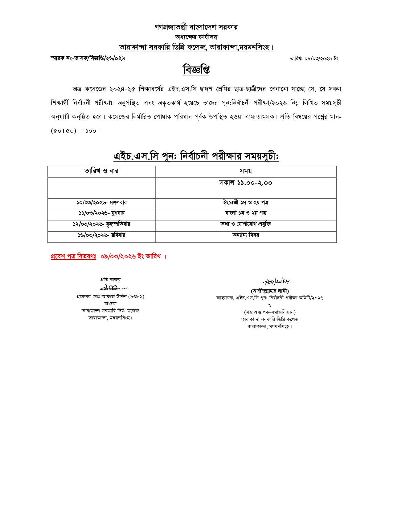 অত্র কলেজের এইচ.এস.সি নির্বাচনী পরীক্ষা/২০২৪ এ অকৃতকার্য ও অনুপস্থিত শিক্ষার্থীদের পূন: নির্বাচনী পরীক্ষায় নিম্নোক্ত সময়সূচি অনুযায়ী পরীক্ষায় অংশগ্রহণ করার জন্য বলা হলো।